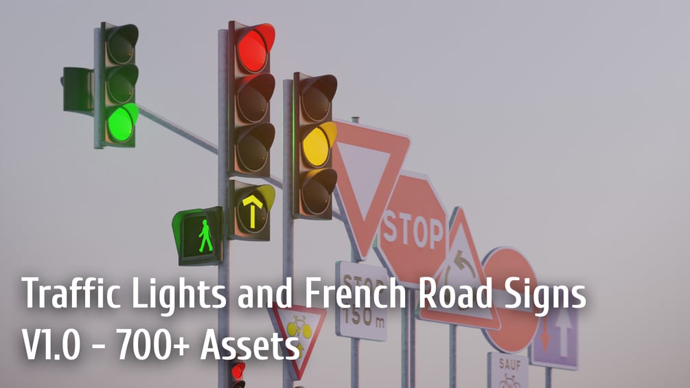 The majority of French Road signs are available in this pack, along with a wide variety of traffic lights.